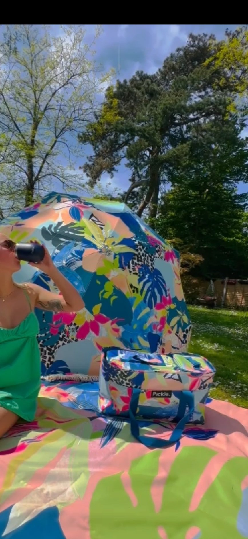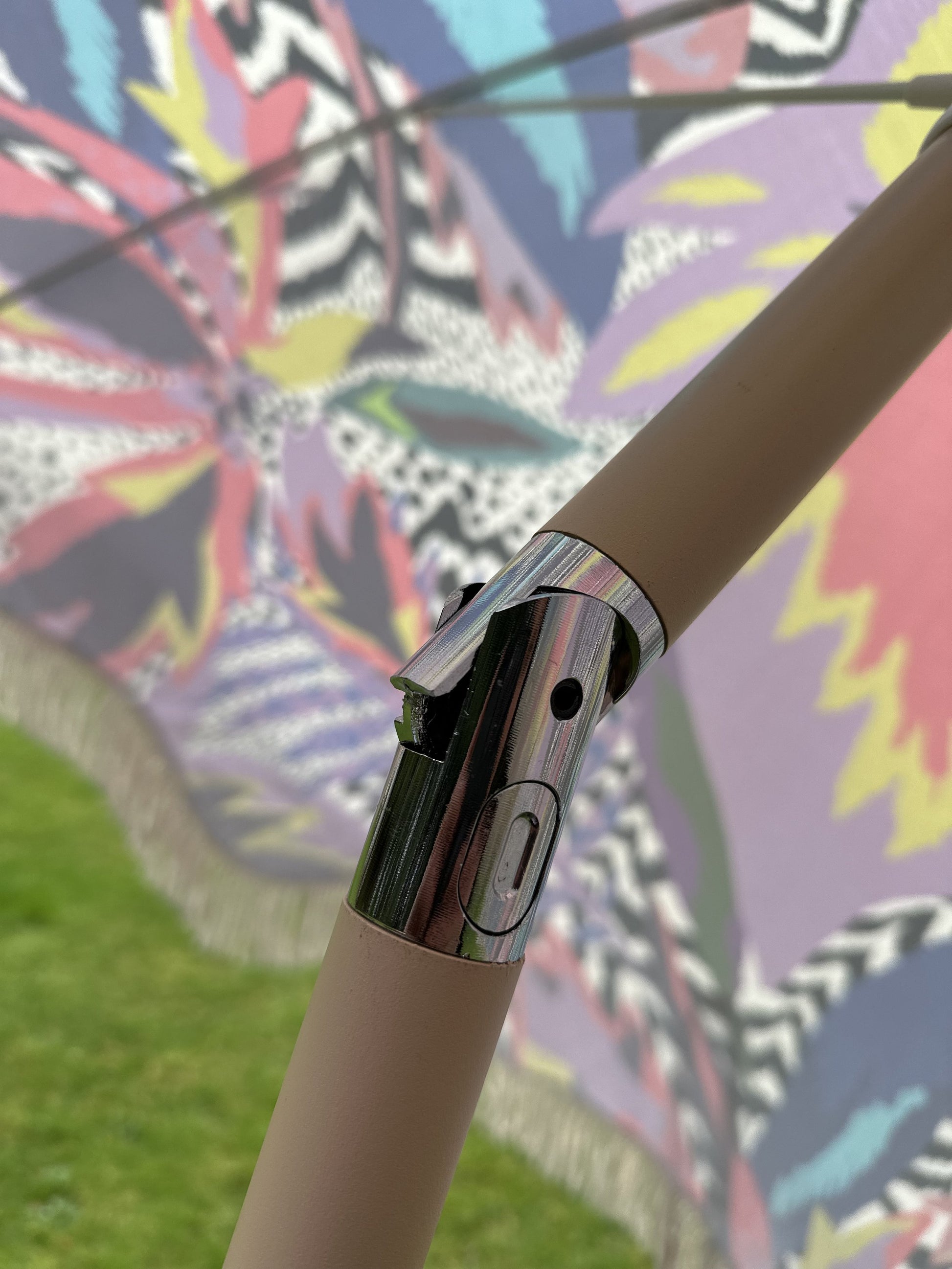 Our parasol combines style with functionality, providing UV50 protection from the sun, while effortlessly elevating your outdoor setup. It features a playful cream fringing and is constructed with a chic wood-effect, powder coated aluminium pole, ensuring it is lightweight and easy to set up. It can be tilted at the push of a button so that you can stay protected as the sun moves.